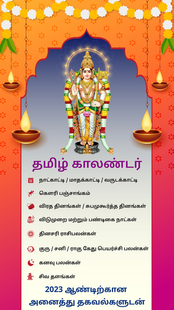 日历的日常视图包括有关吉时、纳拉纳拉姆、戈里纳拉姆、拉古卡拉姆、提提、瑜伽、纳恰特拉姆、库利盖、穆斯林月份和日期、太阳升起和落下时间、每日拉西帕兰、节日、希瓦塔兰加尔、卡纳武帕兰加尔、政府假期等详细信息。用户还可以访问占星预测,如泰米尔新年占星预测、英语新年占星预测、拉古-凯图佩亚尔奇帕兰加尔、古鲁佩亚尔奇预测等。